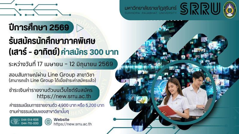 ม.ราชภัฏสุรินทร์ เปิดรับสมัครบุคคลเข้าศึกษาในระดับปริญญาตรี ภาคพิเศษ (เสาร์-อาทิตย์) ปีการศึกษา 2569