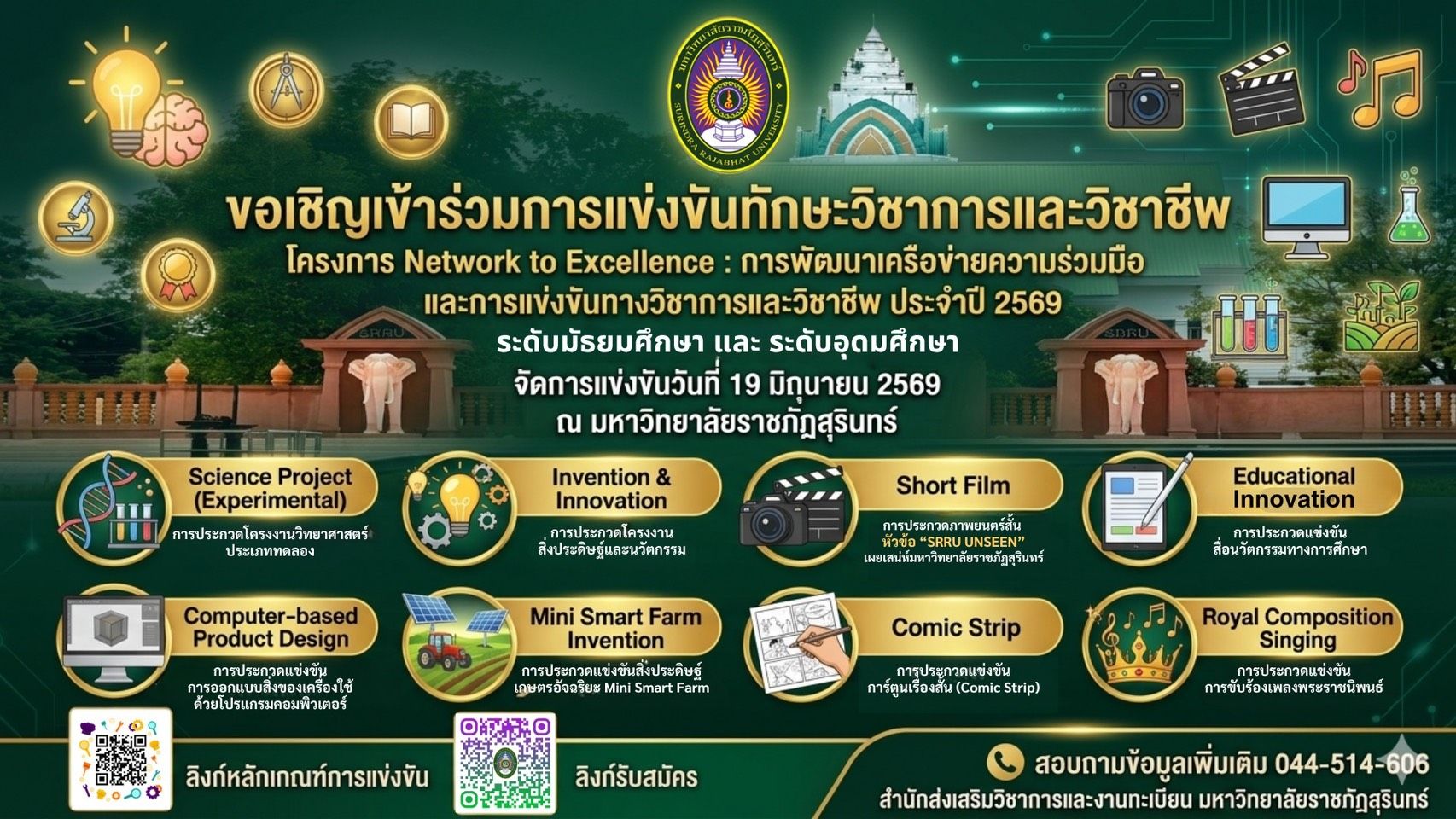 ม.ราชภัฏสุรินทร์ ขอเชิญร่วมแข่งขันทักษะวิชาการและวิชาชีพ โครงการ Network to Excellene : การพัฒนาเครือข่ายความร่วมมือและการแข่งขันทักษะทางวิชาการและวิชาชีพ ประจำปี 2569